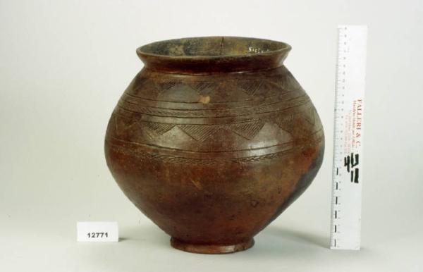 Orlo espanso, corpo biconico, basso piede e fondo concavo. Spalla decorata da due fasce di denti di lupo, impressi a finta cordicella, interrotti da metope, alternati a due bande concentriche campite a linee oblique intrecciate.