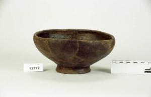 Ciotola coperchio ad orlo rientrante a spigolo vivo, vasca emisferica, basso piede.Sotto il fondo croce graffita.