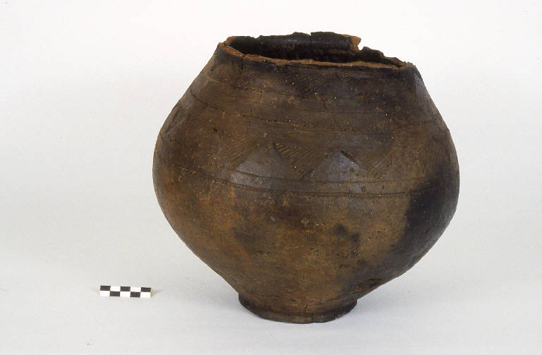 Orlo espanso, corpo biconico con spalla a spigolo vivo, basso piede e fondo concavo. Spalla decorata da due fasce di denti di lupo, graffiti e campiti da linee oblique alternate a due bande concentriche decorate a grana di riso. Superficie ingobbiata in nero.