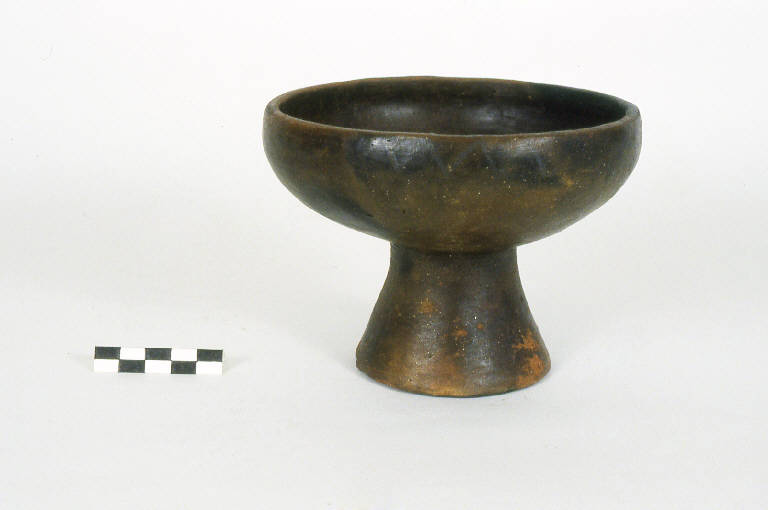 Orlo indistinto arrotondato, labbro leggermente rientrante a spigolo vivo, vasca emisferica schiacciata, alto piede svasato; sotto l'orlo triangoli dipinti. Superficie ingobbiata in nero.