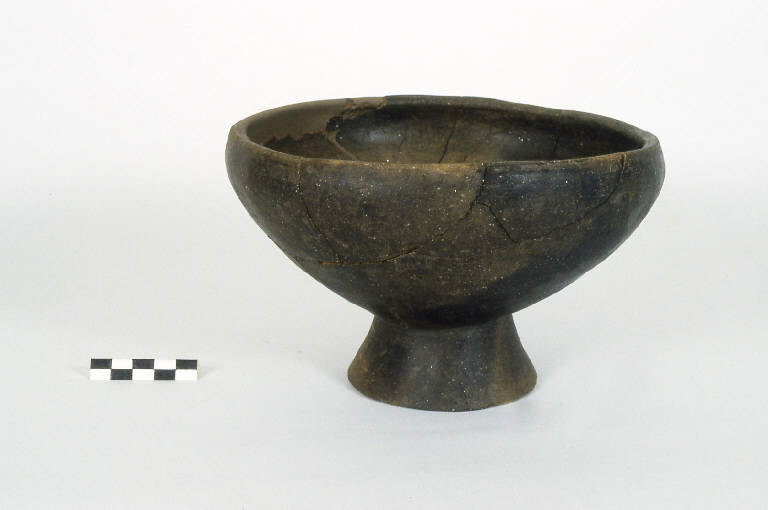Orlo indistinto arrotondato, labbro rientrante a spigolo vivo, vasca emisferica schiacciata, alto piede svasato. Superficie ingobbiata in nero e steccata.