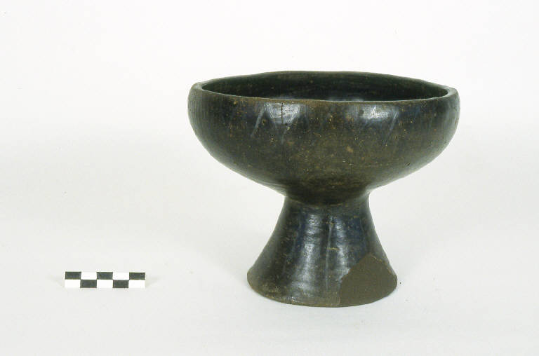 Orlo indistinto arrotondato, labbro rientrante a spigolo vivo, vasca emisferica schiacciata, alto piede svasato con strozzatura di raccordo con la vasca. Sulla vasca decorazione a triangoli bianchi dipinti; sul piede linee verticali. Superficie ingobbiata in nero.