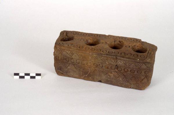 Mattone parallelepipedo. Sulla faccia superiore quattro fori e decorazione impressa a circoletti; sulle facce laterali doppia fascia a denti di lupo campiti con linee diagonali incise, divisi da una fascia con circoletti impressi.
