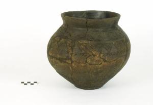 Labbro lievemente estroflesso, corpo biconico a spalla arrotondata, basso piede. Sul corpo decorazione con doppia fascia a denti di lupo a cordicella e linea a trattini a grana di riso.