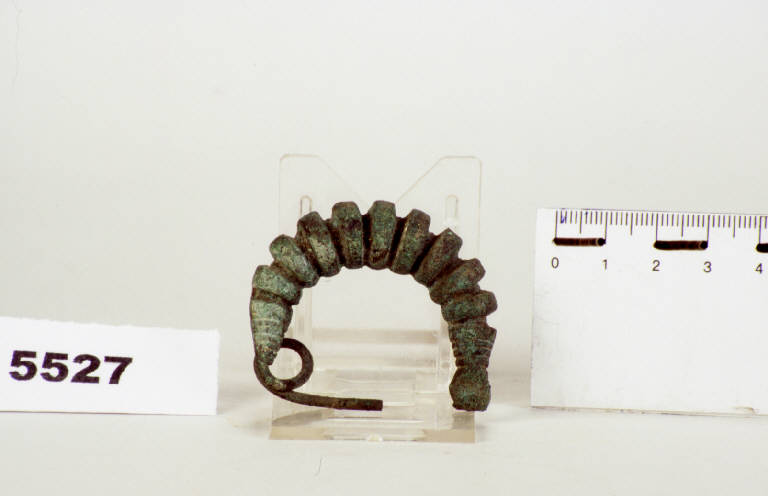 Fibula in bronzo, con arco a grandi coste discoidali e ardiglione diritto.