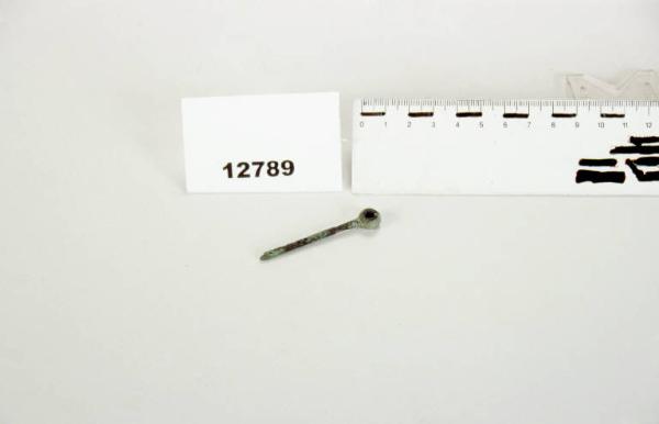 Bastoncino in bronzo a sezione circolare, terminante in una sferetta forata.