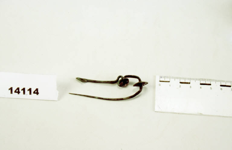 Fibula ad arco serpreggiante, con disco lavorato ad incisione poco sotto la staffa.