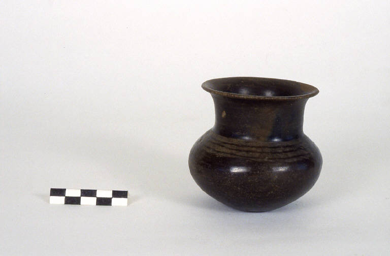 Orlo espanso, alto collo cilindrico, corpo globulare, fondo ombelicato. Superficie a stralucido.
