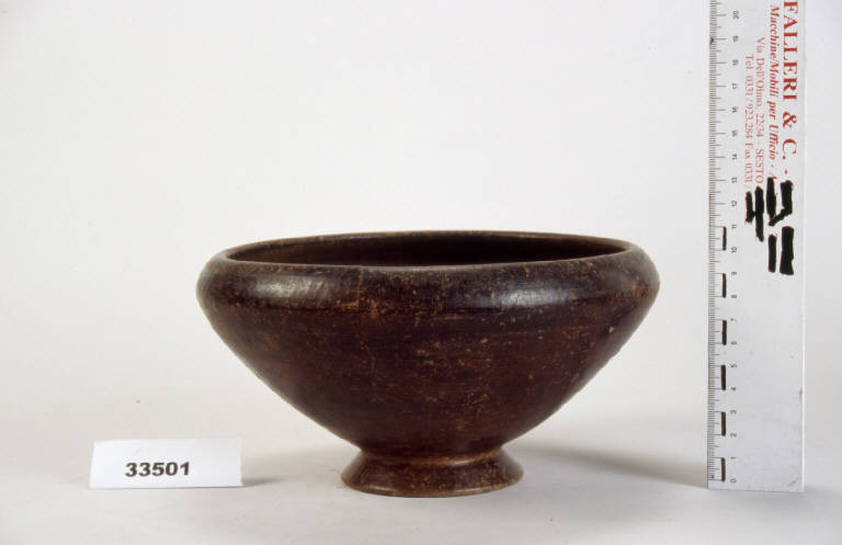 Orlo indistinto, vasca troncoconica, basso piede svasato.