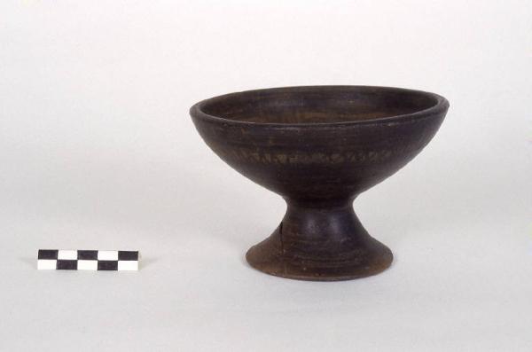 Orlo indistinto, vasca troncococnica, basso piede svasato.Decorazione a stralucido: sulla vasca interna una croce, esternamente stralucido pieno tranne una fascia risparmiata con decorazione a zig-zag.