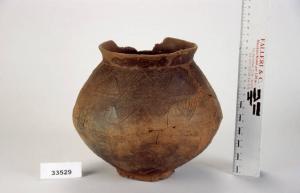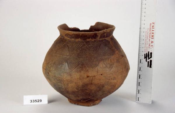 Orlo estroflesso, corpo biconico poco schiacciato, basso piede con fondo concavo. Decorazione a cordicella con due serie di denti di lupo campiti con linee diagonali, separate da due linee orizzontali.