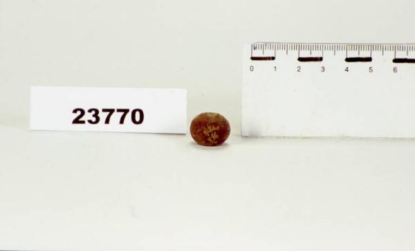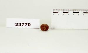 Vago in ambra di forma subcircolare, con foro passante al centro.