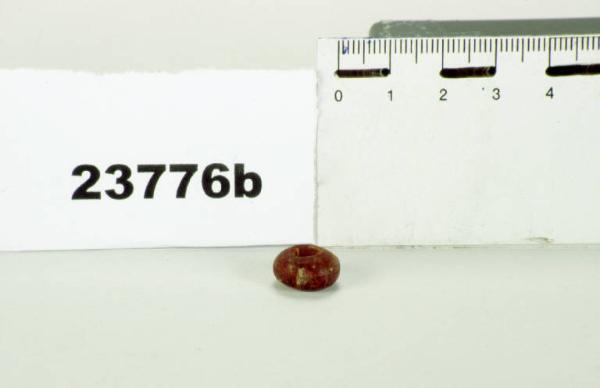 Vago in ambra di forma subcircolare, con foro passante al centro.