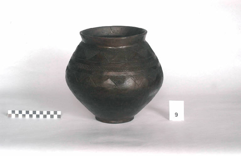 urna biconica a labbro estroflesso, corpo sferoidale, basso piede a fondo concavo.