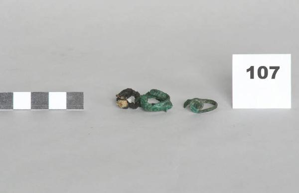 probabile pendaglio composto da tre anelli concatenati, uno in ferro e due in bronzo. Un quarto anello, isolato, ha un terminale avvolto a spirale