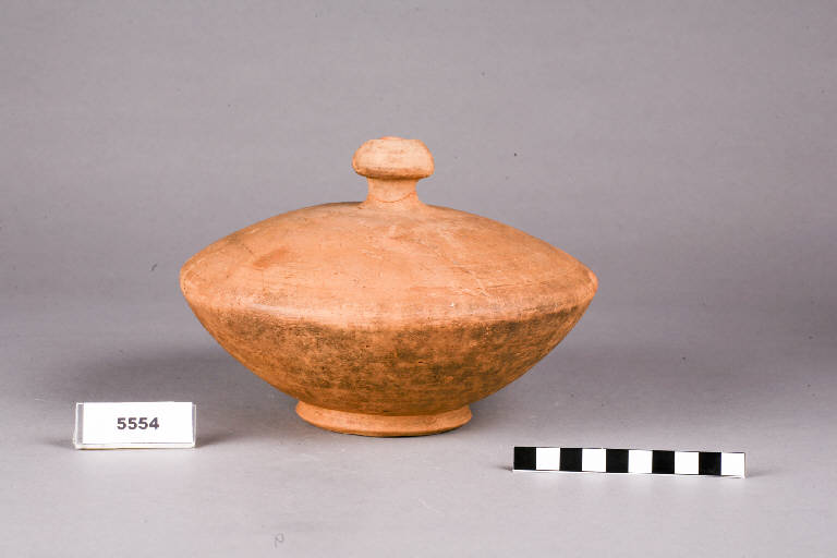 Vaso a trottola a forma schiacciata quasi lenticolare, piede basso ad anello, collo corto e stretto.