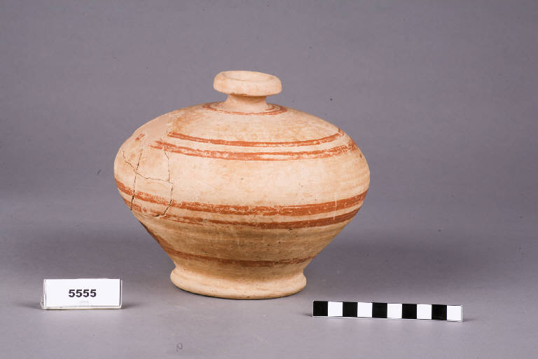 Vaso a trottola a forma globulare, piede basso ad anello, collo corto e stretto.