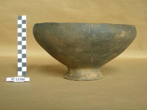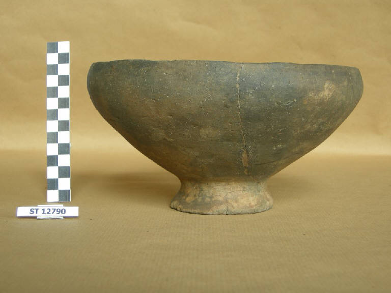 ciotola a vasca troncoconica, labbro rientrante, orlo piatto; basso piede svasato che presenta, sulla faccia esterna, una solcatura cruciforme