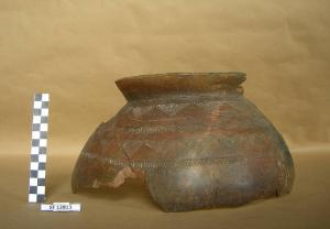 urna biconica a profilo arrotondato, priva di spalla; labbro estroflesso, orlo appiattito alla sommità. Decorata a doppio ordine di denti di lupo, ciascuno dei quali è sottolineato da una linea continua seguita da fascetta a reticolo.