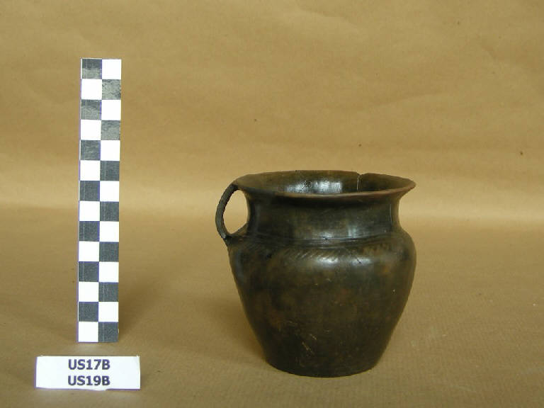 Bicchiere situliforme di piccole dimensioni con ansa a nastro,spalla arrotondata, breve collo e labbro estroflesso; fondo piano. Superficie molto liscia, quasi a stralucido. Decorato con tre leggere solcature parallele che si incurvano sotto l'ansa, sottolineate da una linea frangiata e da tre solcature parallele sopra il fondo.