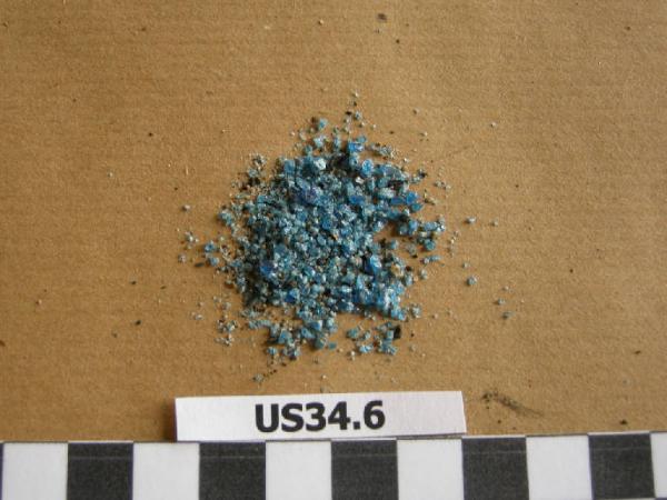 Frammenti minuscoli originariamente riferibili ad un vago in pasta vitrea monocroma, di colore blu chiaro.