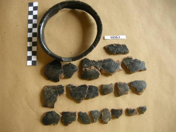 Orlo estroflesso e breve collo concavo di olla (urna cineraria) di colore nero, decorata a stralucido con probabili fascette a linee oblique in senso alternato e sottostante fascetta a reticolo.