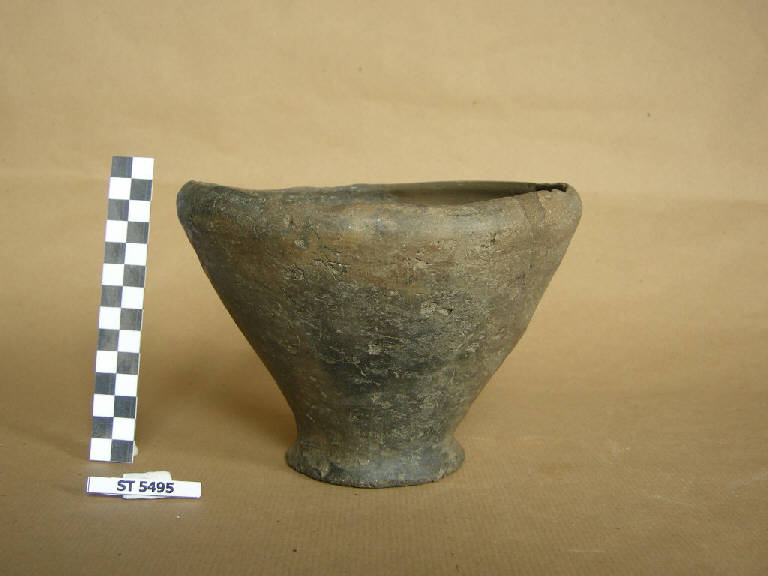 Ciotola a rigido profilo troncoconico, profonda, labbro nettamente rientrante con orlo assottigliato, bassissimo piede svasato e fondo concavo. Superfici brune con infiammature nerastre.