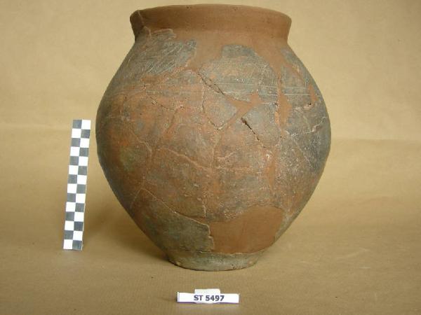 Urna ovoide, labbro estroflesso con orlo appiattito alla sommità, priva di spalla, fondo concavo distinto. Superficie rossastra con infiammature; decorata ad incisione con motivo a doppia fascia di denti di lupo (di modulo ridotto), ognuna delle quali è sottolineata da una linea continua. La decorazione è resa con tecnica apparentemente imprecisa: i denti di lupo si sovrappongono, alcuni non sono campiti.
