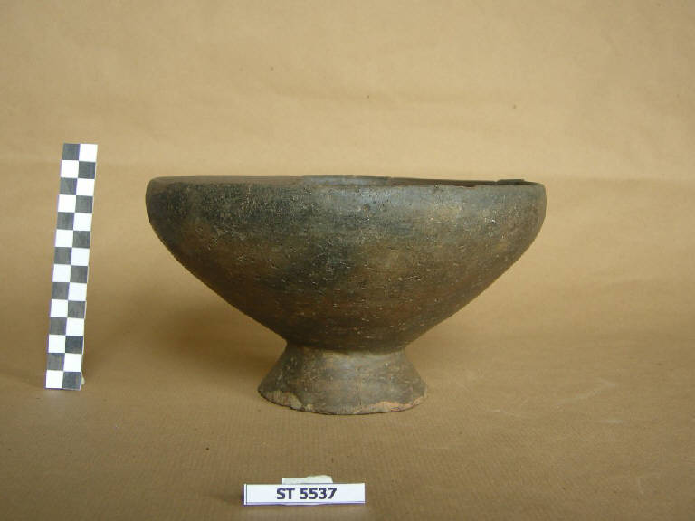 Coppa a vasca troncoconica, labbro rientrante, orlo ingrossato internamente, su basso piede svasato. Superfici bruno scuro lisce, con infiammature nerastre.