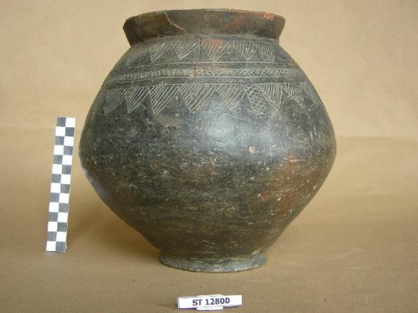 Urna biconico - globulare asimmetrica, linea di massima espansiona a circa metà altezza, spalla appena accennata, labbro estroflesso, fondo concavo distinto. Superficie bruna lisciata; decorazione incisa a denti di lupo su due ordini, separati da fascetta a reticolo. Superstiti minime tracce di pasta bianca dell'originaria decorazione.