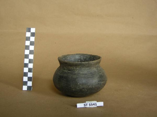 Bicchiere biconico - globulare, ventre schiacciato, labbro estroflesso, fondo lievemente ombelicato. Superfici piuttosto lisce, bruno scuro; decorato al di sopra della spalla con tre solcature orizzontali