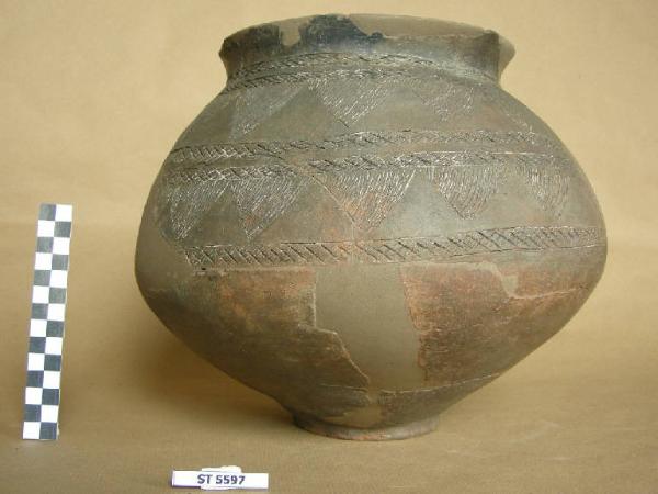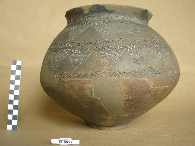 Urna con profilo tra biconico e globulare, asimmetrica, spalla appena accennata; labbro estroflesso, orlo assottigliato, basso piede distinto e fondo concavo. Superfici di colore bruno e rossastro; fino ad oltre la massima espansione ad incisioni: due fascette a reticolo sormontano e separano due teoria di denti di lupo con tratti di campitura molto sottili, fitti e curvi; una quinta fascetta a reticolo delimita inferiormente il secondo ordine. Conservate tracce di pasta bianca, residuo dell'originaria decorazione.