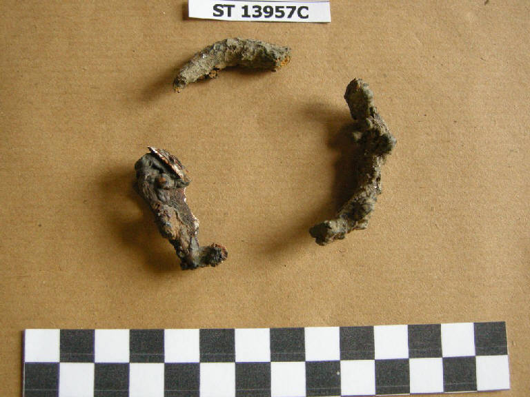 Tre frammenti semifusi in ferro, incurvati, a sezione subcircolare di diametro molto variabile, cui sono attaccati frammenti di osso (probabile anello?). Un frammento presenta un'estremità a sezione cava, sia pure molto deformata dal calore del fuoco.