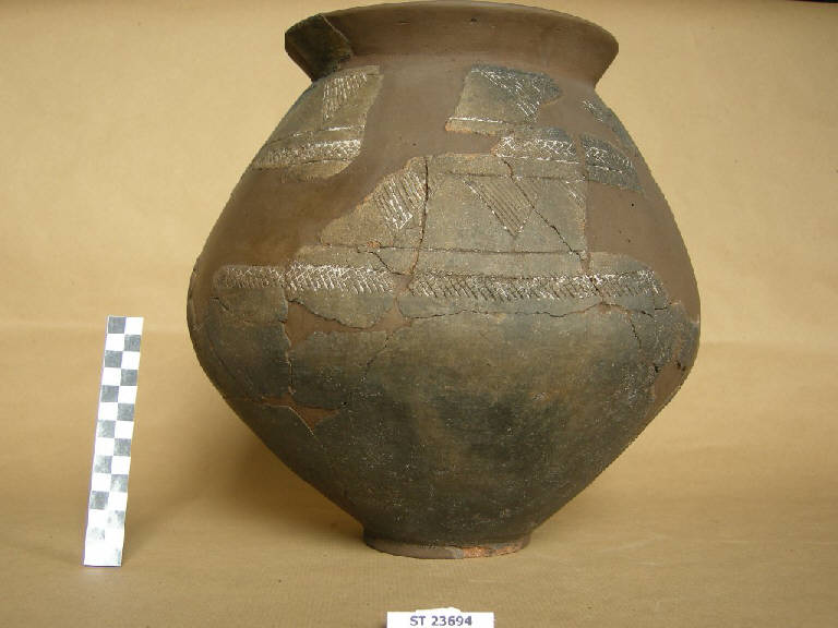 Urna biconico - globulare con linea di massima espansione poco sotto la metà altezza, spalla diritta, stretta imboccatura con labbro estroflesso ed orlo arrotondato, fondo concavo distinto. Superfici bruno scuro. Decorata ad incisioni fino ad oltre la massima espansione, con motivo a due fasce di denti di lupo delimitate ciascuna da linee continue e separate l'una dall'altra da una fascetta a reticolo. La seconda fascia è sottolineata da una fascetta a reticolo, senza delimitazione inferiore; notevoli tracce di pasta bianca che ornava la decorazione.