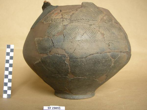 Urna biconico - globulare con linea di massima espansione circa a metà altezza, spalla diritta, fondo concavo distinto. Superfici bruno scuro. Decorata a leggere e sottili incisioni con motivo a due fasce di denti di lupo separate l'una dall'altra da una fascetta con teoria di piccole "X". La seconda fascia è sottolineata da una fascetta a reticolo, senza delimitazione inferiore.