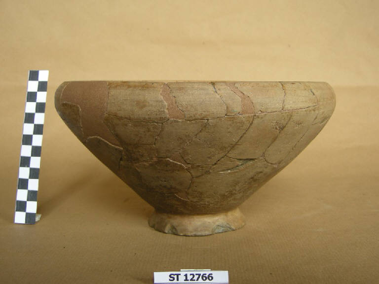 Ciotola a vasca troncoconica, labbro rientrante, orlo inclinato internamente, basso piede ad anello a facce oblique; superficie di colore bruno con ingobbiatura arancio.