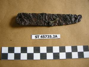 Lama di coltello a dorso diritto, in prossimità dell'immanicatura conserva due fori passanti, uno dei quali è trapassato da un ribattino.