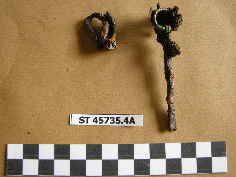 Nettaunghie con anello di sospensione a spirale; la parte distale si biforca. Al corredo da toeletta cui appartiene potrebbe forse essere pertinente anche un occhiello in ferro.