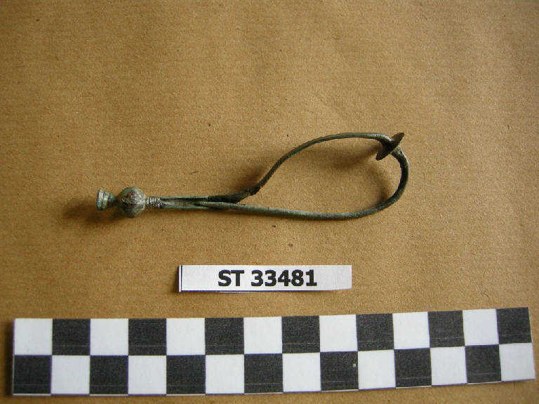 Fibula con arco a nastro, decorato da nervatura centrale, dischetto fermapieghe lenticolare; staffa piuttosto lunga con sezione a "C", desinente con globetto preceduto da profilatura e seguito da elemento troncoconico profilato.