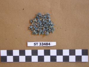 Perla in vetro completamente sbriciolata in innumerevoli frammenti, colore grigio - azzurro - verde.