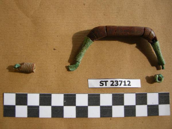 Fibula ad arco composto di forma trapezoidale, rivestito in ambra (almeno elementi a sezione rettangolare); manicotti profilati; un elemento troncoconico in ambra infilato su anima in bronzo, non ricomponibile, doveva costituire la parte terminale della staffa.