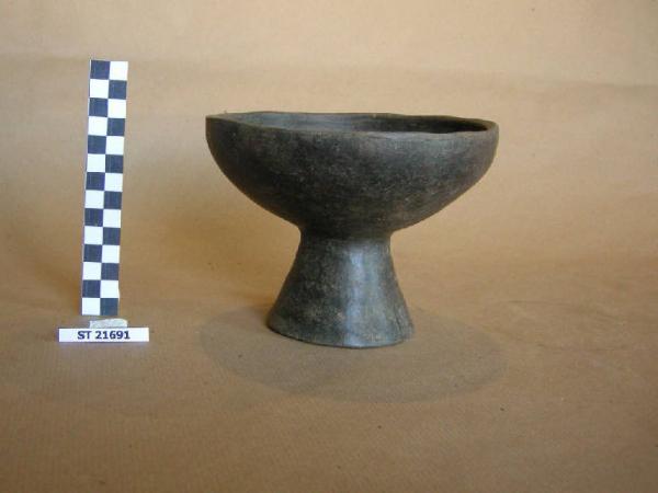 Coppa con vasca a calotta, labbro poco rientrante, orlo appiattito alla sommità, su medio piede troncoconico. Superfici di colore bruno, lisciate a stecca.