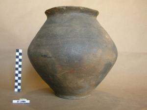 Urna biconica con linea di massima espansione a circa metà altezza, labbro estroflesso, fondo concavo distinto. Superfici bruno rossastro, lisciate e con infiammature nerastre. Decorata a sottili incisioni entro la metà superiore con motivo a doppia fascia di denti di lupo preceduta, inframmezzata e sottolineata da fascetta a reticolo.