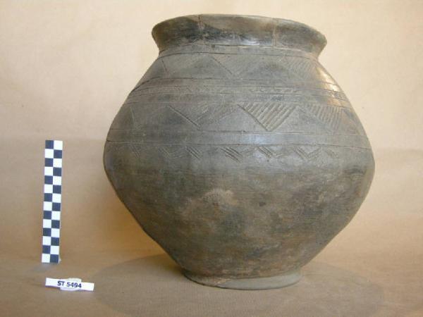 Urna biconica con linea di massima espansione a circa metà altezza, alto labbro estroflesso con orlo appiattito, su bassissimo ma ampio piede. Superfici bruno chiaro, molto lisciate. Decorata a profonde incisioni con motivo a doppia fascia di denti di lupo inframmezzata da fascetta a reticolo e sottolineata da una linea seguita da chevrons. Alcuni denti di lupo della fascia inferiore sono campiti a linee con orietamento opposto; è presente un riempitivo alberiforme.