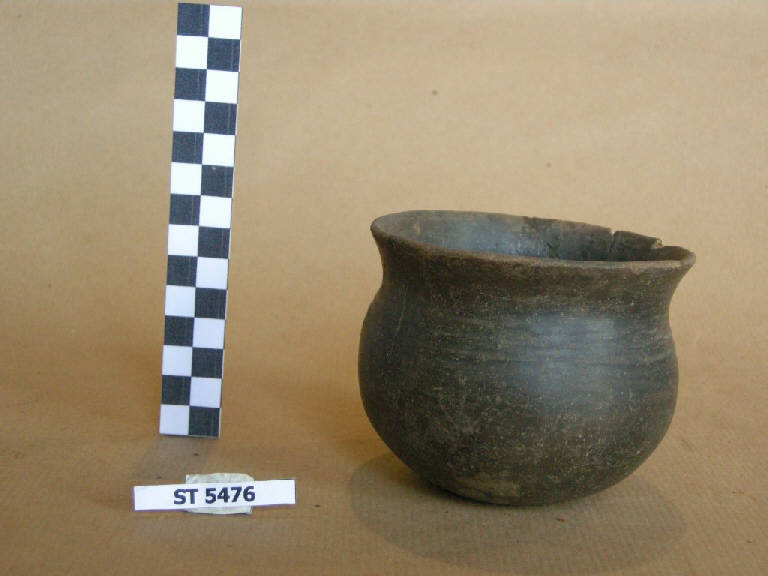 Bicchiere globulare basso e largo, con profilo ad "S" ed ampia imboccatura; labbro estroflesso, fondino concavo appena accennato; superfici di colore bruno lisciate a stecca. Decorato sopra la spalla da tre solcature orizzontali parallele.