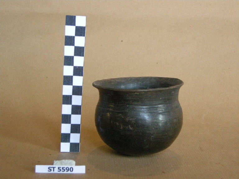 Bicchiere a corpo globulare con spalla alta appena accennata, larga imboccatura con labbro estroflesso, fonco convesso. Superfici di colore bruno scuro uniforme, molto lisce. Decorato da tre sottili solcature piuttosot profonde sopra la spalla.
