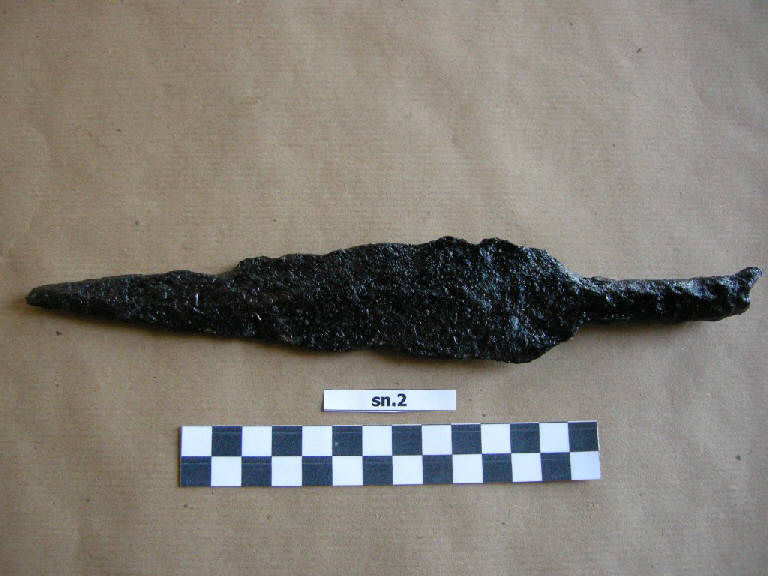 Cuspide di lancia in ferro a sezione romboidale con lieve costolatura mediana, innesto a cannone.