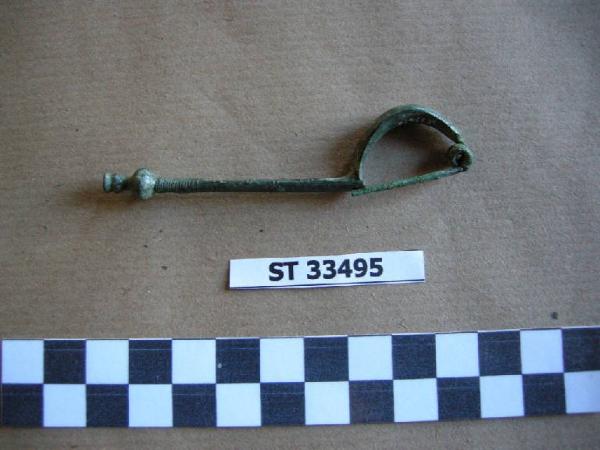 Fibula a sanguisuga con molla tripla, staffa lunga con sezione a "C" desinente con profilatura a globetto seguito da doppio tronco di cono cavo (a vaso). Arco decorato con sottili linee incise alle estremità (variante B tipologia Von Elese 1986).