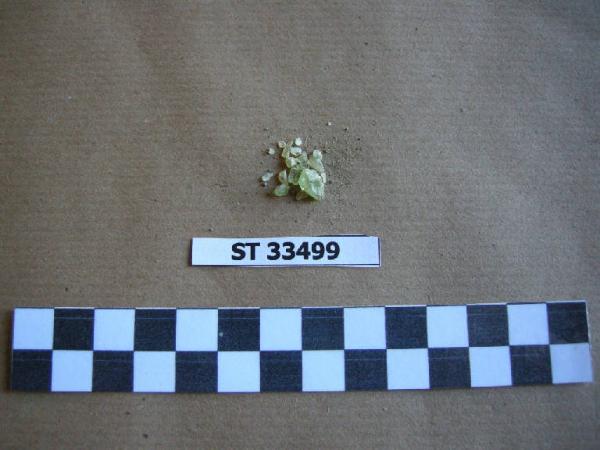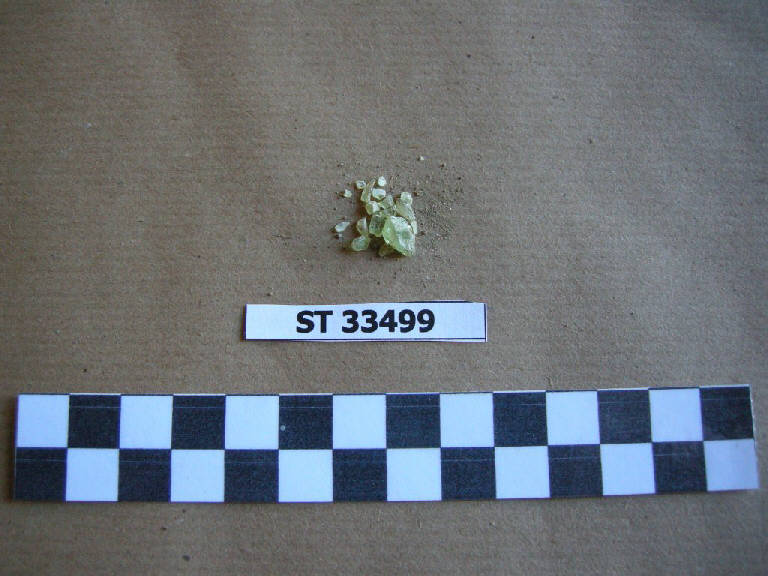 Frammenti di perla di vetro di colore verde molto chiaro/ giallino. Forma non ricostruibile.