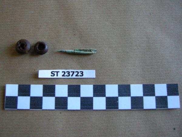 Staffa di fibula con sezione a "C" e terminale appuntito, su cui erano infilate due perle bitroncoconiche in ambra decorate con profilature e attraversate l'una da un foro passante circolare, l'altra da un foro quadrilobato.